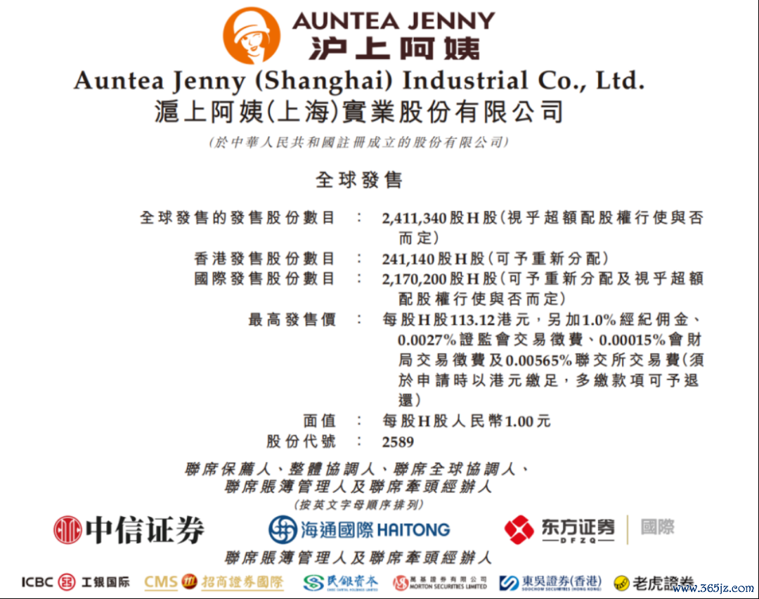 根据公告,沪上阿姨拟全球发售241.134万股H股,其中香港发售股份24.114万股,国际发售股份217.02万股,另有15%的超额配股权。发售价区间为95.57港元/股至113.12港元/股,每手30股。