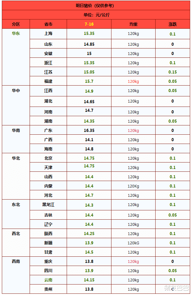 从最新消息了解,受供应调整,预计,7月16日,外三元标猪报价在14.59元/公斤,后市关注购销情绪的变化,尤其是,规模以上猪企出栏节奏的变化!